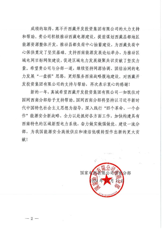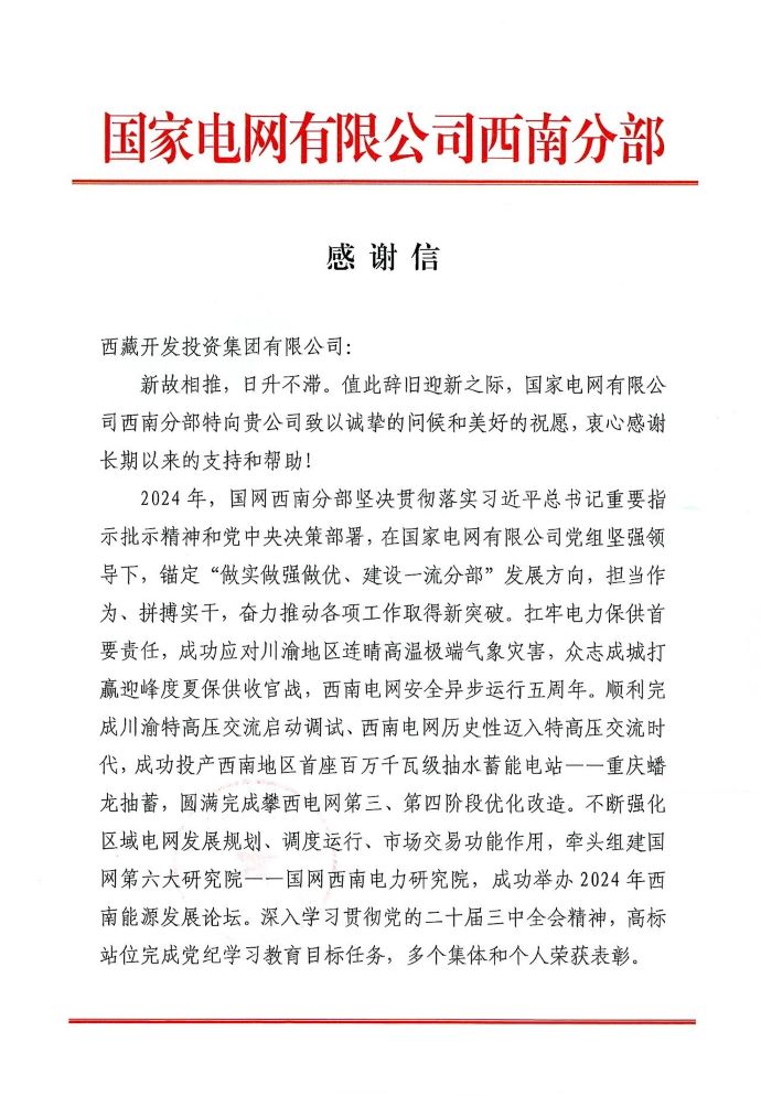 新年伊始,西藏開(kāi)投集團收到來(lái)自國網(wǎng)電力有限公司西南分部的一封感謝信,對集團積極推動(dòng)西藏電源建設,提前謀劃西藏昌都地區能源資源整體開(kāi)發(fā),推動(dòng)昌都負荷中心抽蓄建設,以及支持西南能源發(fā)展論壇舉辦,推動(dòng)區域電網(wǎng)目標網(wǎng)架建設,促進(jìn)區域電力發(fā)展凝聚共識作出的貢獻表示感謝。