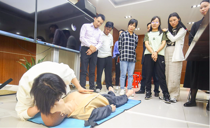 培訓過(guò)程中,導師通過(guò)示范指導、疑問(wèn)解答、模擬訓練等方式,著(zhù)重演示了海姆立克急救法、心肺復蘇操作、防震減災地震自救以及創(chuàng )傷救護等現場(chǎng)救護操作方法,著(zhù)重強調了應急救護“黃金四分鐘”及心肺復蘇胸外按壓的至關(guān)重要性,全體參訓人員在導師的指導下對所學(xué)項目進(jìn)行模擬練習,對不規范的流程與動(dòng)作,進(jìn)行糾正,確保參訓人員真正掌握應急救護技術(shù)。