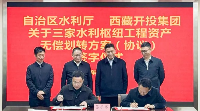 12月11日,自治區水利廳與西藏開(kāi)投集團在拉薩簽署旁多、滿(mǎn)拉、拉洛三大水利樞紐工程資產(chǎn)無(wú)償劃轉協(xié)議,標志著(zhù)西藏國有企業(yè)改革邁出堅實(shí)步伐。自治區水利廳黨組副書(shū)記、廳長(cháng)和忠華,區政府國資委黨委委員、副主任于雷,西藏開(kāi)投集團黨委書(shū)記、董事長(cháng)祁騰武出席簽字儀式并講話(huà)。自治區水利廳黨組成員、副廳長(cháng)趙輝與西藏開(kāi)投集團黨委委員、副總經(jīng)理尼瑪代表雙方簽署協(xié)議。集團領(lǐng)導羅布次仁、陳焱罡出席儀式。