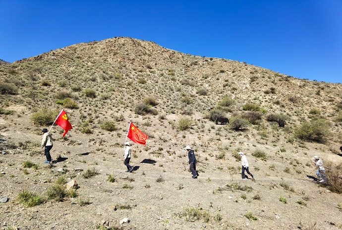 此次踏勘全程22公里,海拔垂直高度1200米。9時(shí)30分,新能源公司踏勘人員肩抗黨旗、國旗,背負測量設備和儀器從山腳沿項目進(jìn)場(chǎng)道路出發(fā)。在徒步上山過(guò)程中,天氣炙烤灼人,大家三五隨群,或健步直沖或駐足而立,或仔細測量或落筆記錄,或討論工作或抒懷暢想。大家互相幫助、互相鼓勁,隨著(zhù)海拔的不斷攀升,身體負重不斷加大,氣息開(kāi)始急促、腳步不再有力,每前進(jìn)一步都特別的困難,但眼前的大山壯闊雄渾,遠處的冰川雪景圣潔空靈,頭頂的天空湛藍纖塵不染,讓大家心曠神怡,真切感受到高度是一種境界,攀登是一種追求,是一種“小天下”的胸懷和氣魄!