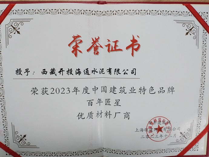 西藏開(kāi)投海通水泥公司榮獲中國建筑業(yè)特色品牌百年匠星優(yōu)質(zhì)材料廠(chǎng)商榮譽(yù)稱(chēng)號