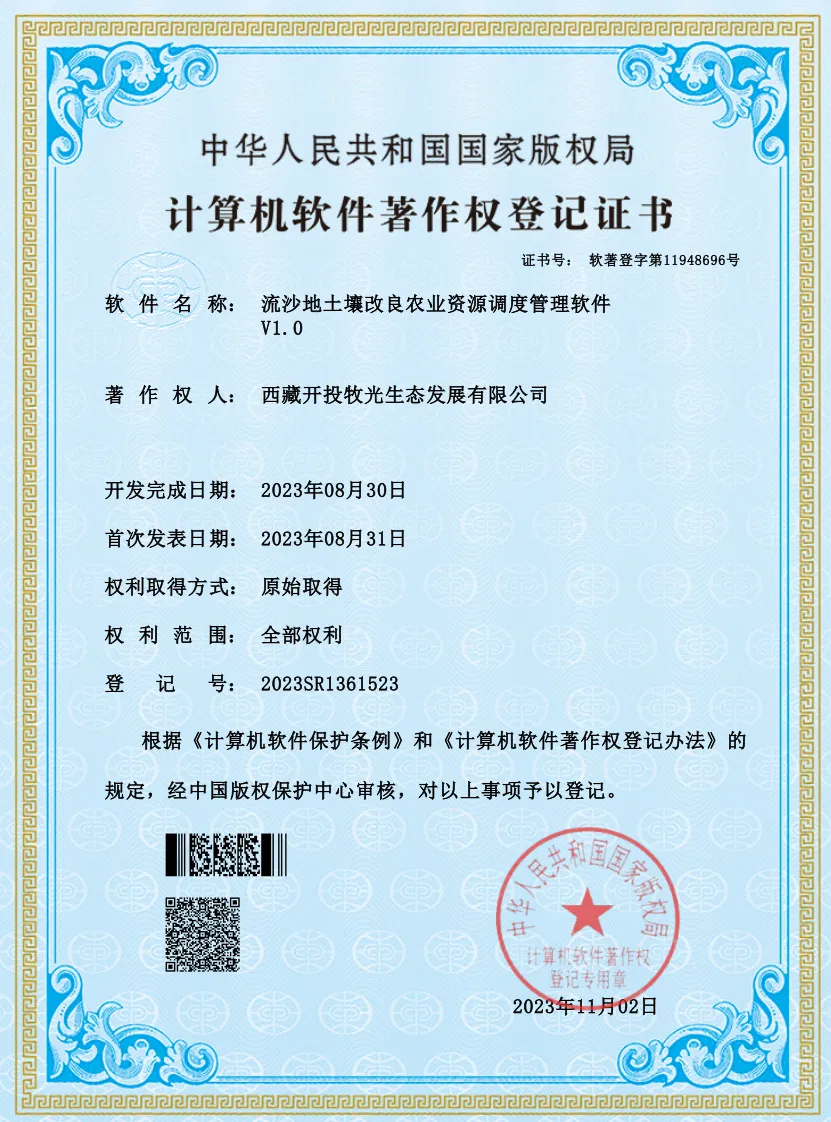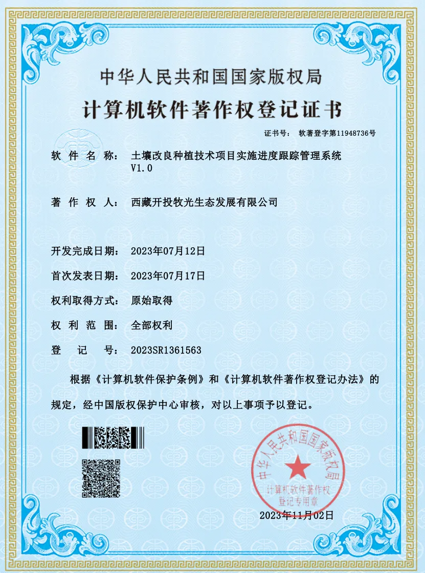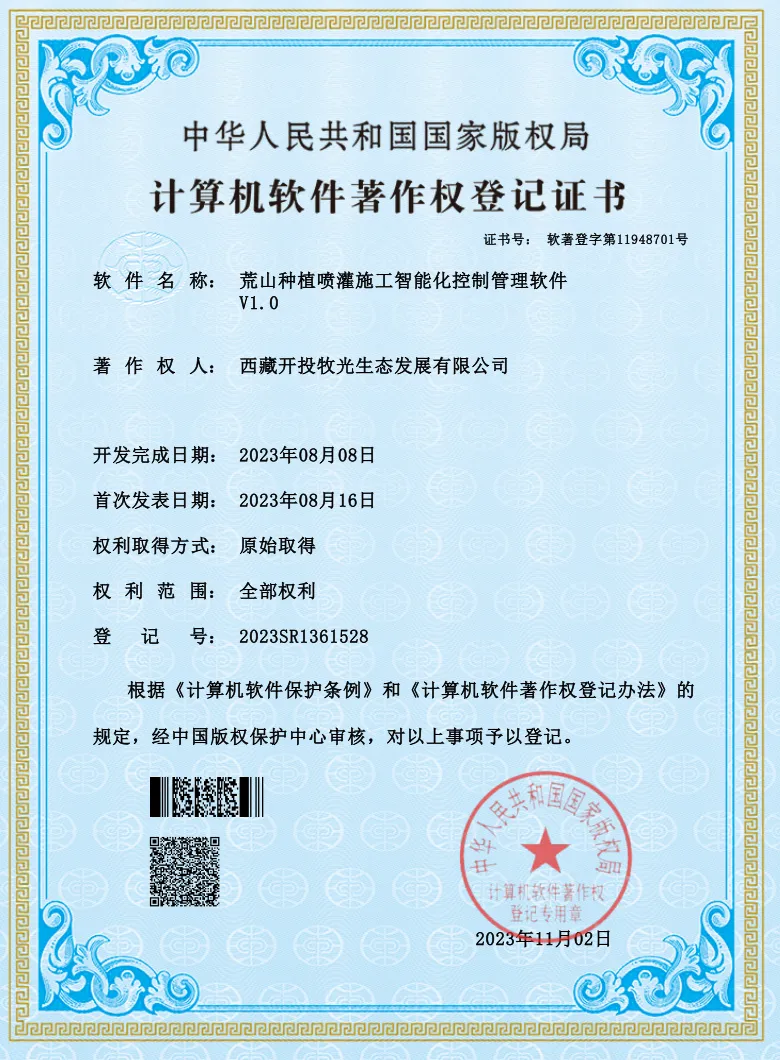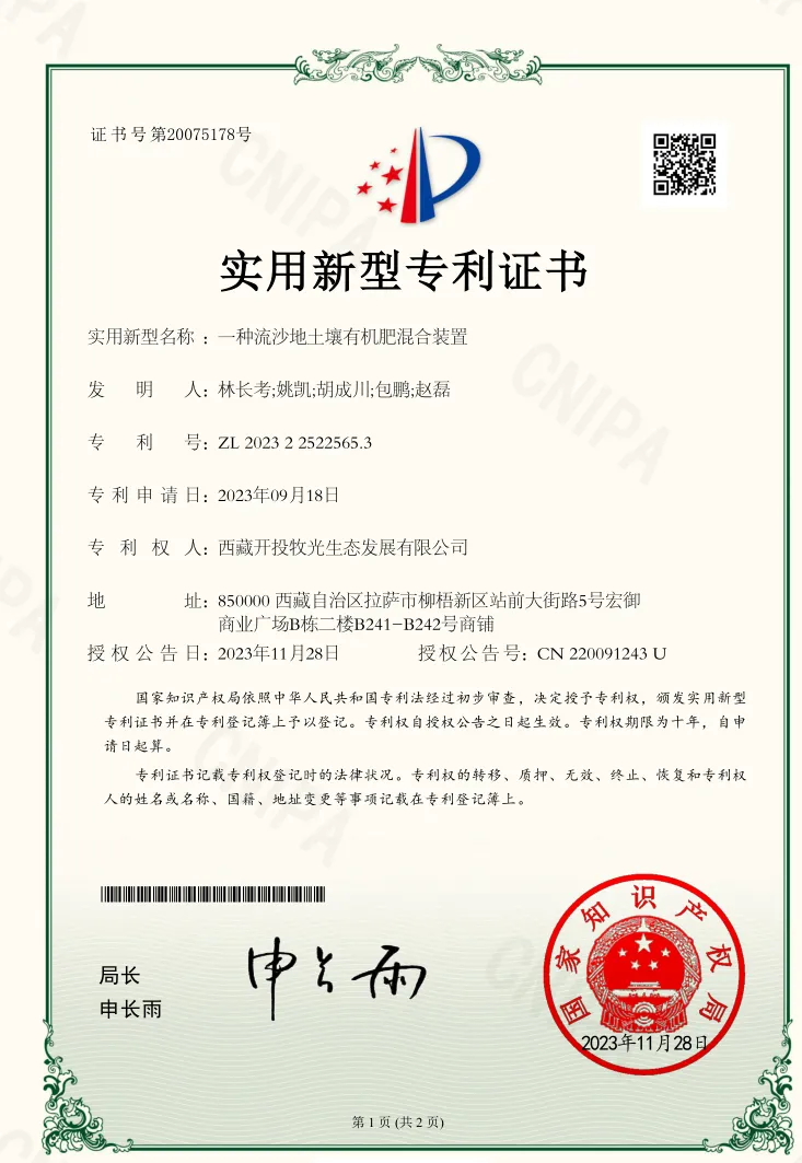 經(jīng)過(guò)一年多的摸索,西藏開(kāi)投在拉薩南北山綠化工程項目形成了豐富的技術(shù)成果,于近日成功申報獲取了1項實(shí)用新型專(zhuān)利和5項計算機軟件著(zhù)作權。分別是《一種流沙地土壤有機肥混合裝置》實(shí)用新型專(zhuān)利和《土壤改良種植技術(shù)項目實(shí)施進(jìn)度跟蹤管理系統V1.0》《流沙地土壤改良技術(shù)數據采集分析管理系統V1.0》《流沙地土壤改良農業(yè)資源調度管理軟件V1.0》《荒山種植噴灌施工計劃數字化管理系統V1.0》《荒山種植噴灌施工智能化控制管理軟件V1.0》計算機軟件著(zhù)作權。