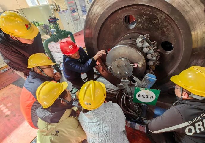 新員工在檢修現場(chǎng)了解水輪發(fā)電機組系統布置。