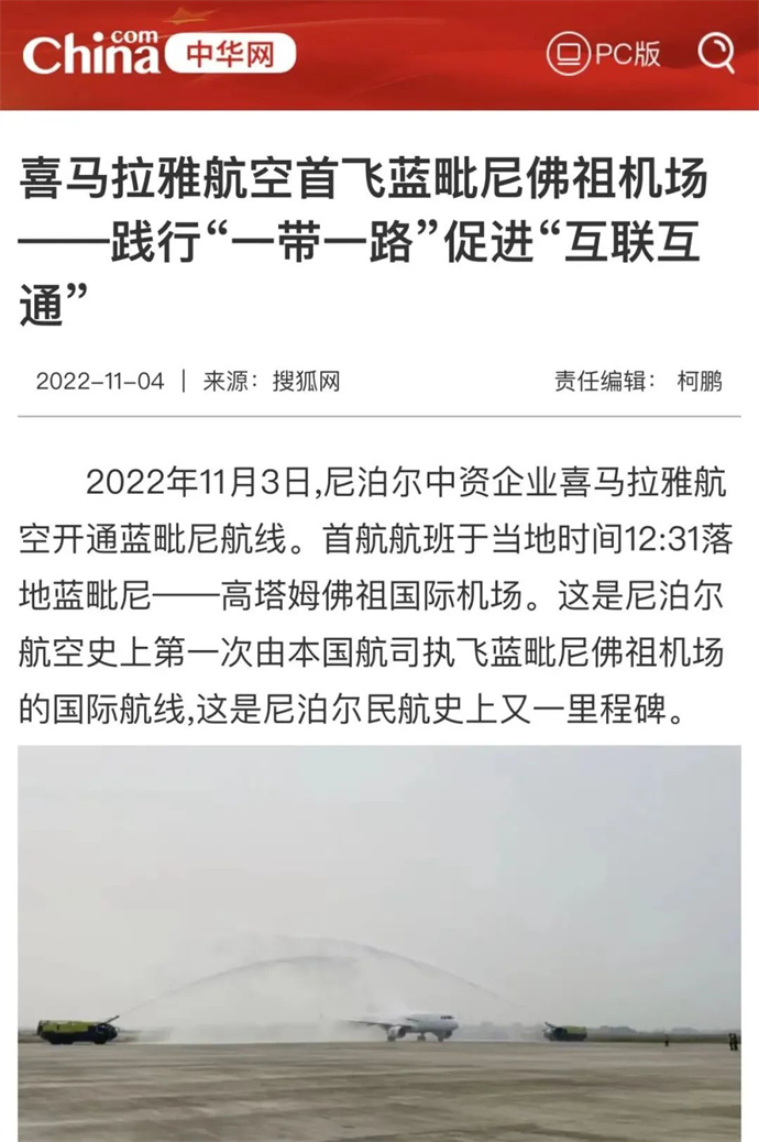 中華網(wǎng)、中國網(wǎng)、中企網(wǎng)、中國日報、光明日報、中國旅游新聞網(wǎng)、中國西藏新聞網(wǎng)、拉薩新聞網(wǎng)等媒體報道喜航開(kāi)通加德滿(mǎn)都至藍毗尼航線(xiàn)