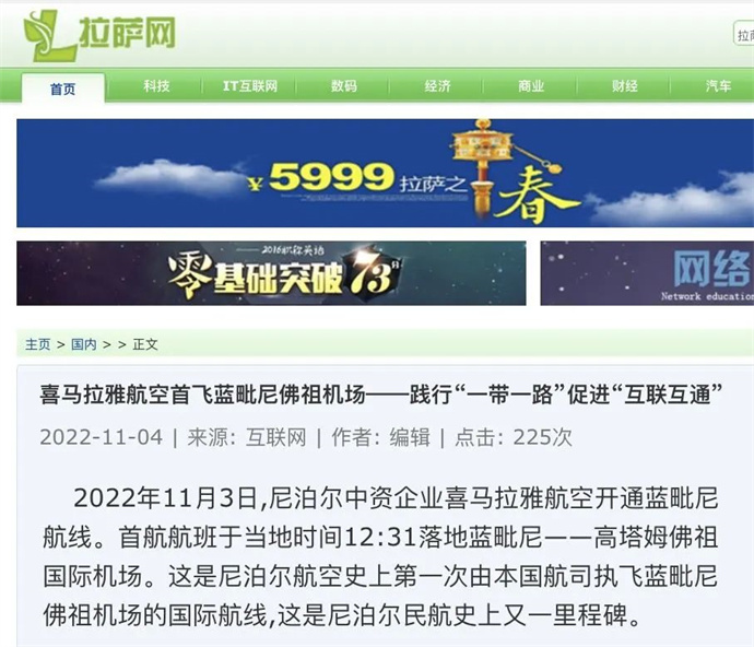 ?。ň幷甙矗?2022年11月4日至9日,中華網(wǎng)、中國網(wǎng)、中企網(wǎng)、中青網(wǎng)、中國日報網(wǎng)、光明日報、騰訊網(wǎng)、新浪網(wǎng)、搜狐網(wǎng)、今日頭條、中國旅游新聞網(wǎng)、中國西藏新聞網(wǎng)、拉薩新聞網(wǎng)、西藏生活網(wǎng)、西藏視窗、每日經(jīng)濟西藏、西藏途游網(wǎng)等媒體報道了《喜馬拉雅航空首飛藍毗尼佛祖機場(chǎng)》文章。摘要如下: