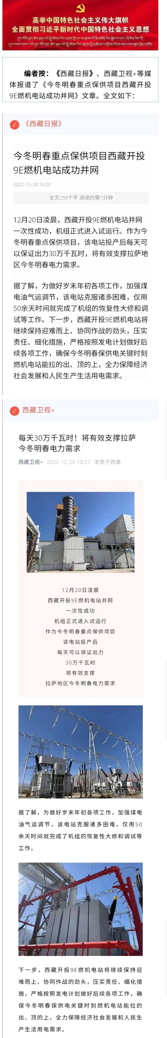 《西藏日報》、西藏衛視+報道今冬明春重點(diǎn)保供項目西藏開(kāi)投9E燃機電站成功并網(wǎng)