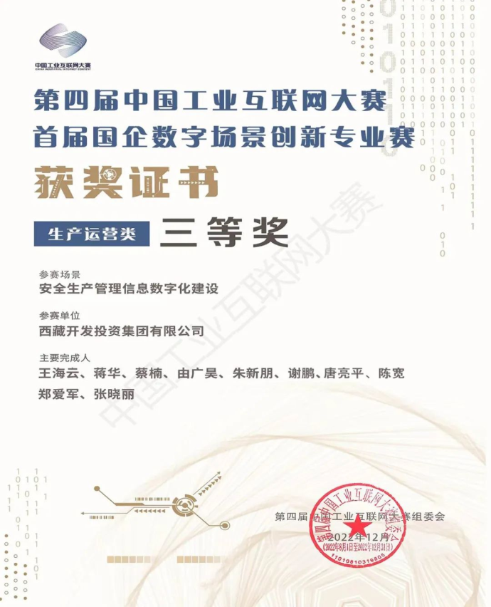 近日,西藏開(kāi)發(fā)投資集團有限公司在國務(wù)院國資委首屆國企數字場(chǎng)景創(chuàng )新專(zhuān)業(yè)賽中榮獲生產(chǎn)運營(yíng)類(lèi)三等獎。