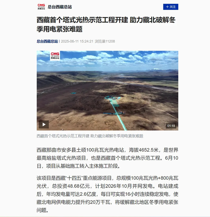 媒體報道丨全球海拔最高、西藏首個(gè)塔式光熱電站開(kāi)工建設