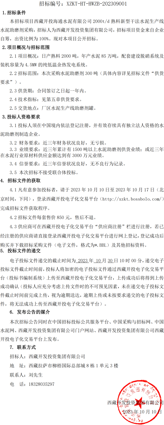 西藏開(kāi)投海通水泥有限公司 2000t/d 熟料新型干法水泥生產(chǎn)線(xiàn)水泥助磨劑采購招標公告