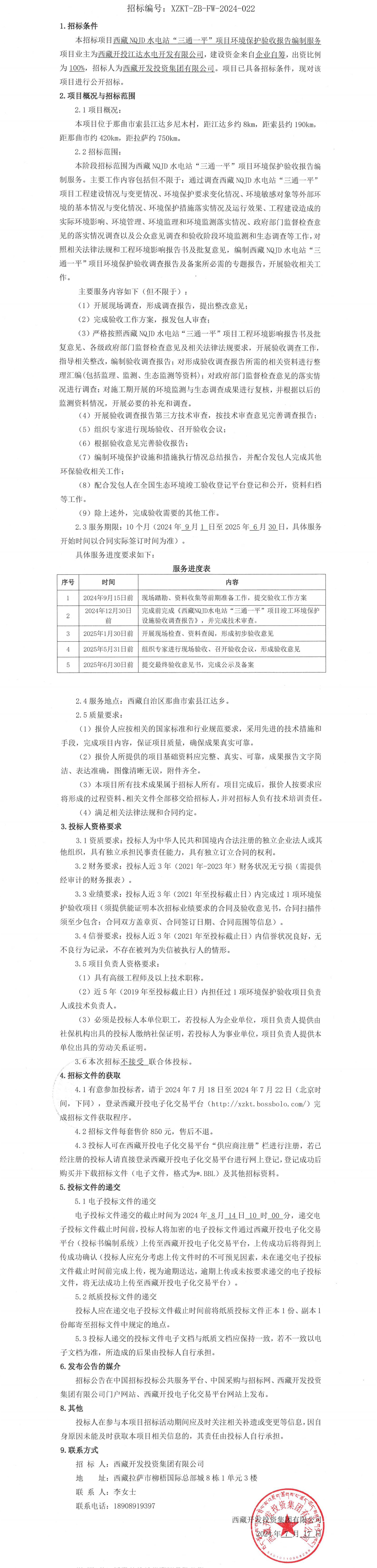 西藏NQJD水電站“三通一平”項目環(huán)境保護驗收報告編制服務(wù)招標公告