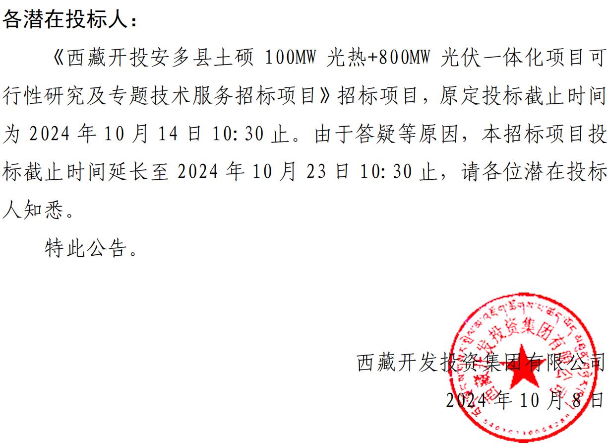 關(guān)于延長(cháng)《西藏開(kāi)投安多縣土碩 100MW光熱+800MW 光伏一體化項目可行性研究及專(zhuān)題技術(shù)服務(wù)招標項目》投標截止時(shí)間的公告