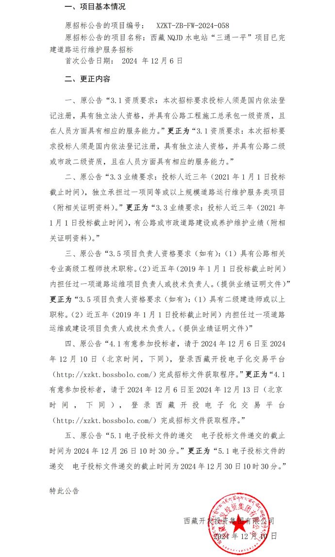 關(guān)于《西藏NQJD水電站“三通一平”項目已完建道路運行維護服務(wù)招標》的更正公告