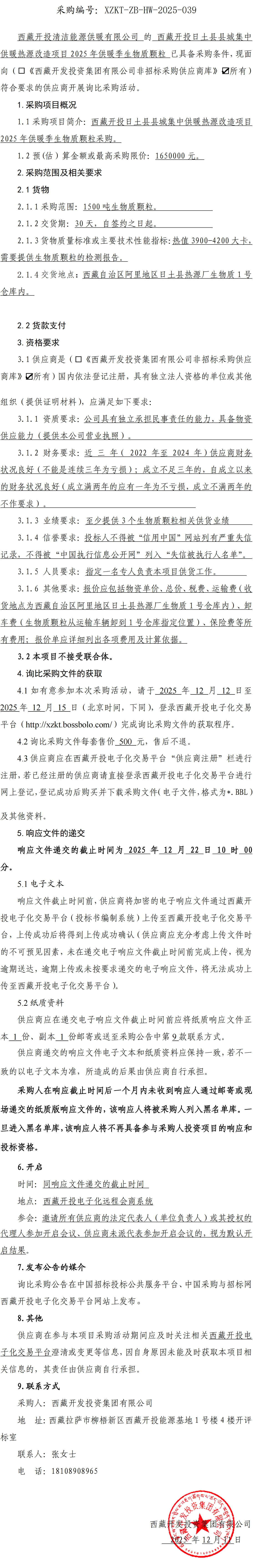 西藏開投日土縣縣城集中供暖熱源改造項(xiàng)目2025年供暖季生物質(zhì)顆粒詢比采購公告